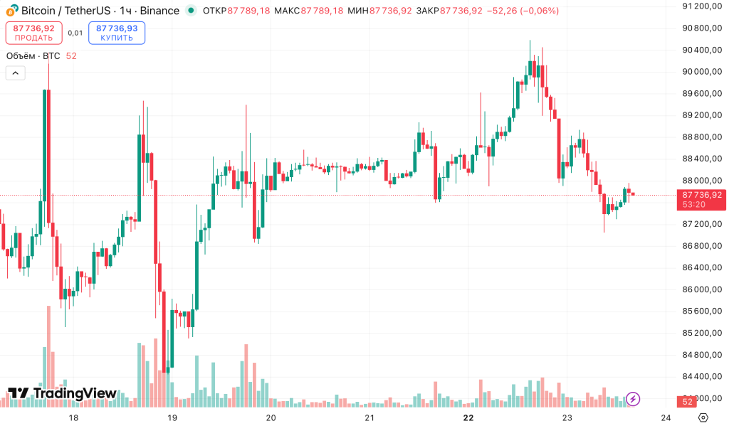 — The Kobeissi Letter (@KobeissiLetter) December 23, 2025На криптовалютном рынке ситуация противоположная: за прошедшие 24 часа цена биткоина снизилась на 2,7%. На момент написания актив торгуется около $87 600. В годовом выражении падение составило 6,3%.