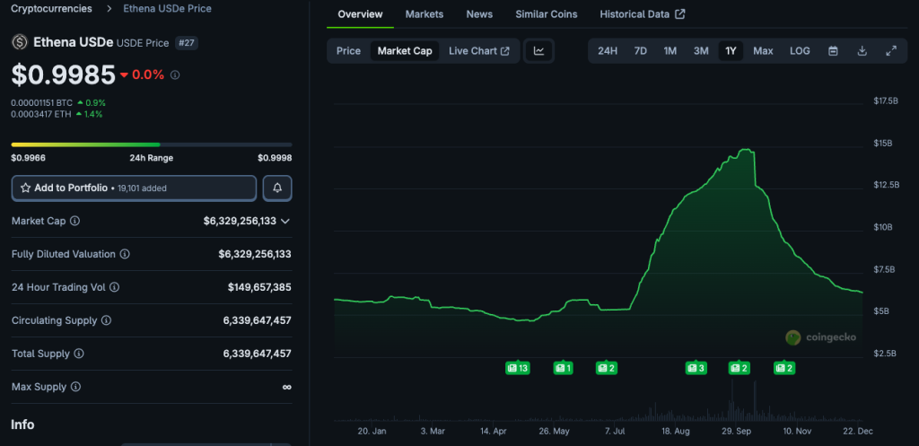 Актив занимает 27 место в рейтингах рыночной капитализации, находясь на четвертой строчке среди крупнейших «стабильных монет».Годовая доходность USDe далека от былых значений — всего 4,3%.