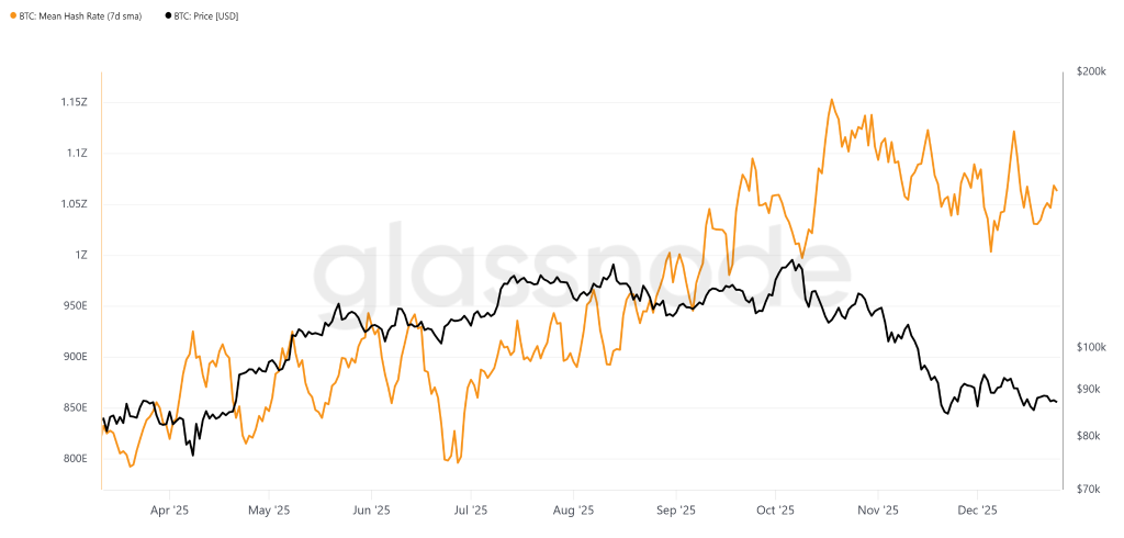 При этом хершейт биткоина удержался выше отметки 1 ZH/s. Согласно Glassnode, сглаженное семидневной скользящей среднее значение находится на уровне ~1,06 ZH/s.