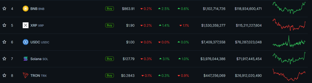 Восстановление ведущих активов окрасило топ-10 криптовалют по капитализации в зеленый цвет. Альткоины демонстрируют положительную динамику, отыгрывая недавнее падение.
