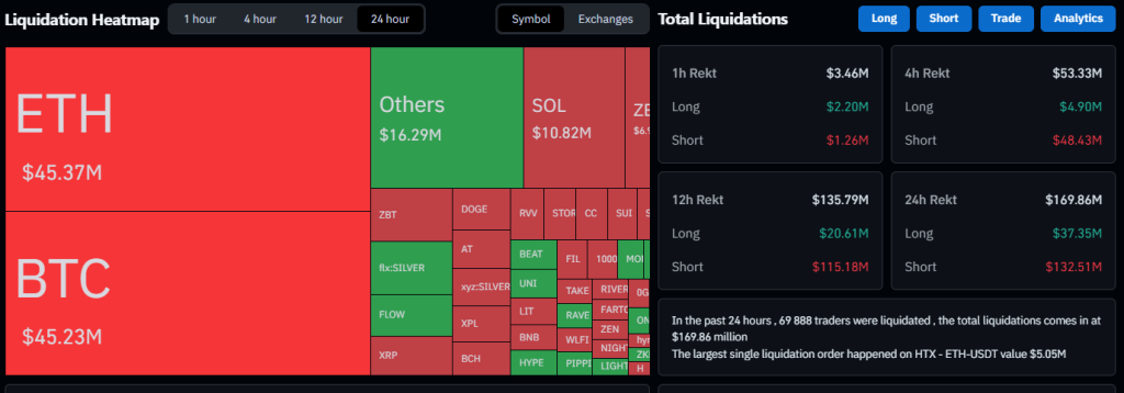 Резкий импульс вверх спровоцировал волну ликвидаций — на $169,86 млн. Из них $45,37 млн пришлось на эфир.
