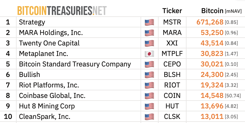 Топ-10 корпоративных держателей биткоина. Источник: Bitcoin Treasuries