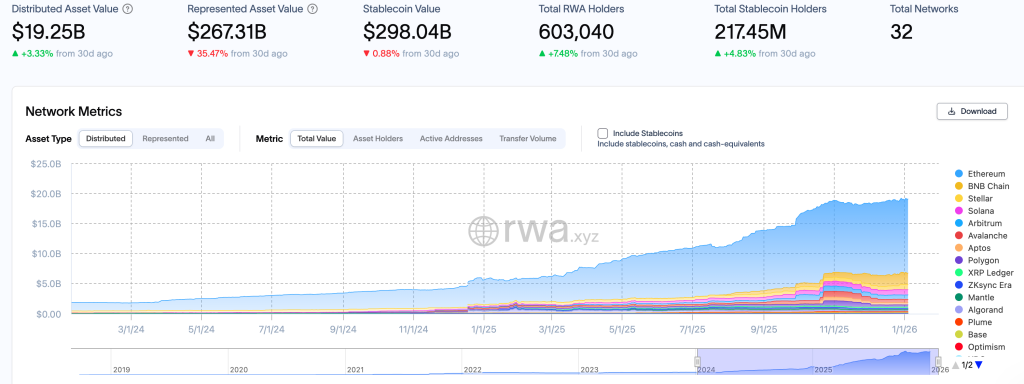 Ethereum лидирует по активности в сфере токенизации активов реального мира (RWA). Доля платформы в сегменте объемом свыше $19 млрд составляет около 65%.