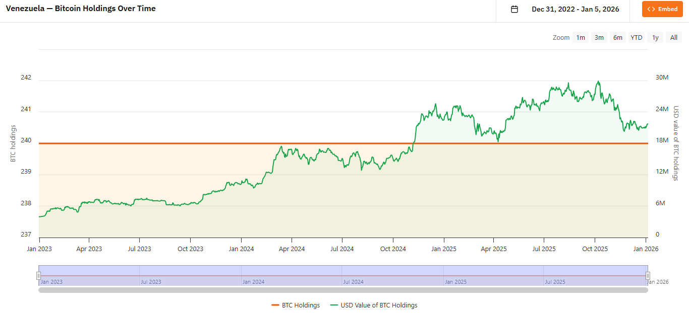 По данным публичных ончейн-трекеров, подтвержденный биткоин-баланс Венесуэлы — около 240 BTC. По текущим ценам это примерно $22,11 млн.