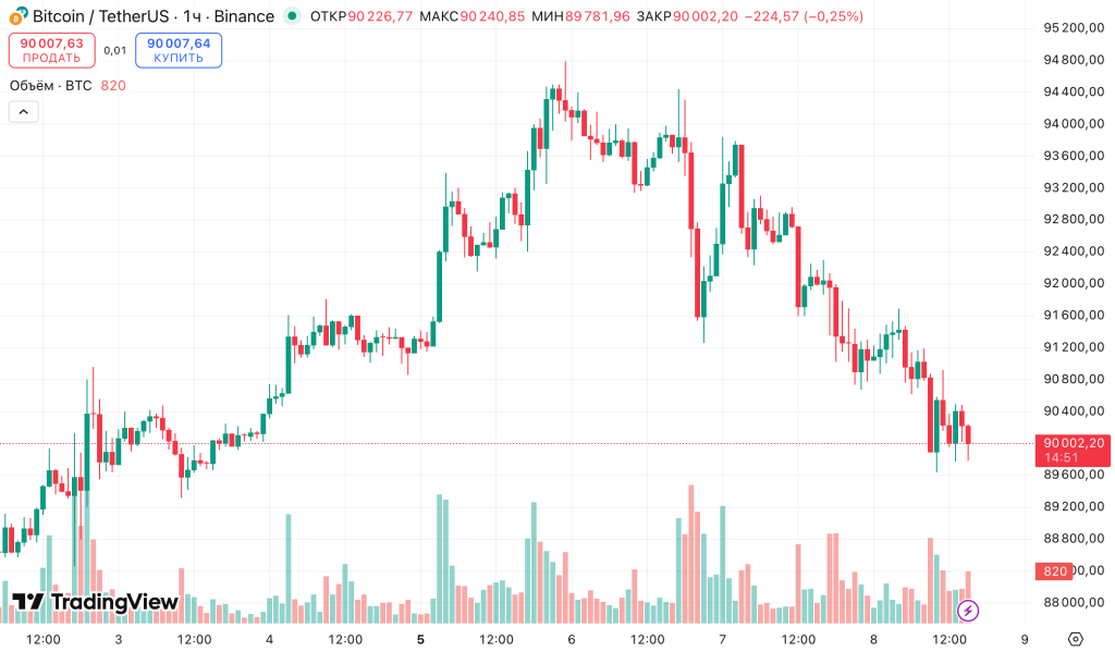 На момент написания биткоин торгуется около $90 000. За последние сутки цена актива снизилась на 2,3%.
