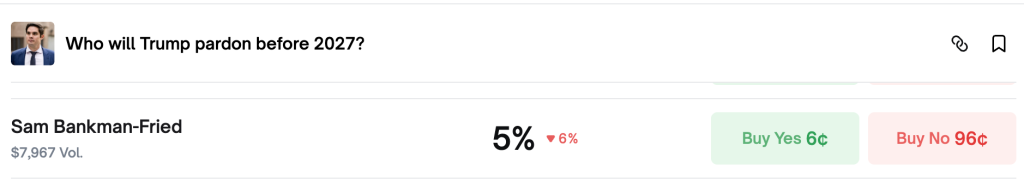 Несмотря на то, что Трамп освободил основателя Silk Road Росса Ульбрихта и экс-главу Binance Чанпэна Чжао, в случае с Бэнкманом-Фридом рынок настроен скептично. Вероятность его выхода из тюрьмы до 2027 года оценивается сообществом всего в 5%.