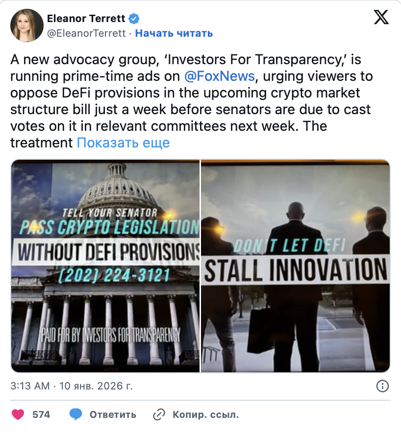Авторы видео призывают зрителей оказать давление на сенаторов. Главная цель кампании заключается в исключении DeFi из благоприятной нормативной базы. Ожидается, что эти нормы войдут в законопроект о структуре рынка. Рассмотрение документа в банковском комитете Сената запланировано на 16 января.