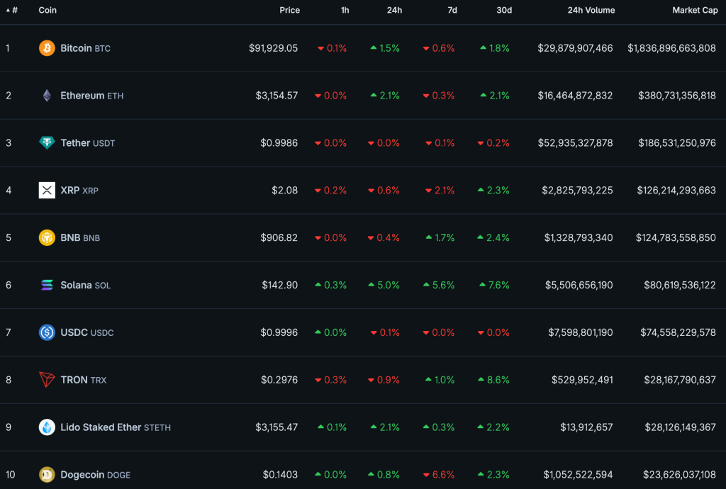 За последние сутки цифровое золото подорожало на 1,5%, протестировав уровень $92 000. Цена Ethereum увеличилась на 2,1%, Solana — на 5%.