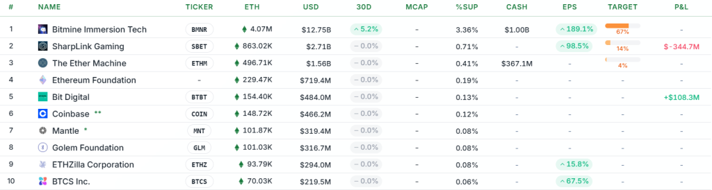 Топ-10 крупнейших держателей Ethereum среди публичных компаний. Источник: Strategic ETH Reserve.