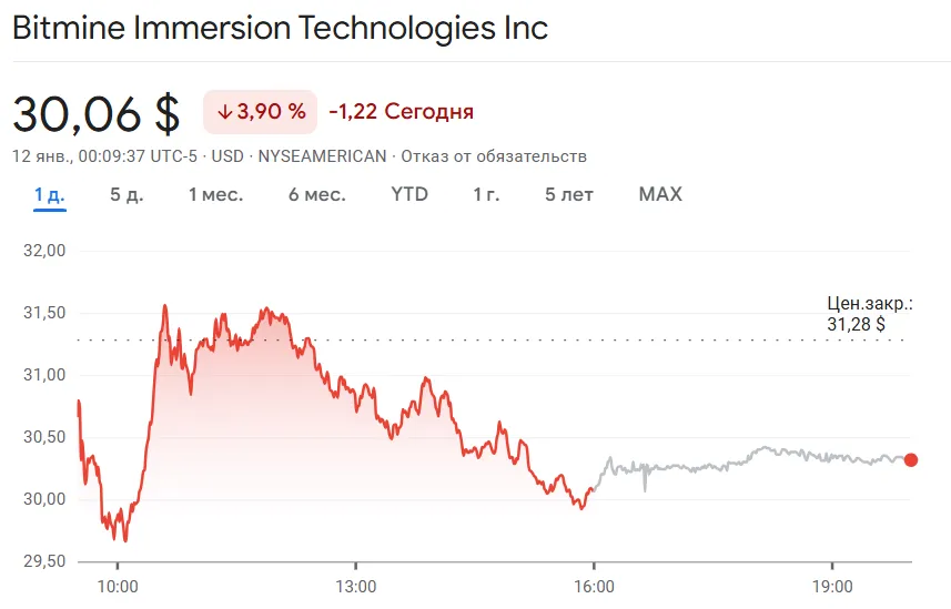 Несмотря на наращивание позиций, акции BitMine торгуются по $30,06. Это на 80% ниже исторического максимума, достигнутого в июле 2025 года.