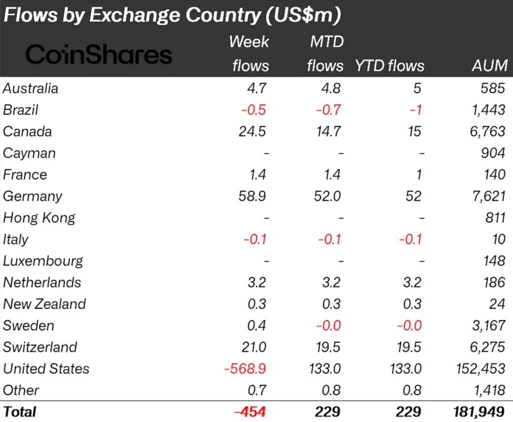 Основная волна продаж пришлась на США — отток составил $569 млн. Германия лидировала с притоком в размере $58,9 млн. На Канаду и Швейцарию пришлось $24,5 млн и $21 млн соответственно.
