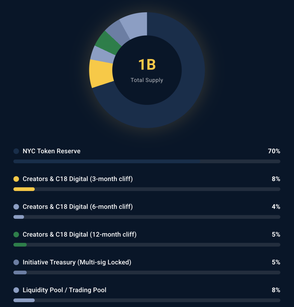 Согласно токеномике, 40% монет из общей эмиссии в 1 млрд NYC предназначены для вознаграждения сообщества. 25% пойдут на ликвидность, 15% — на разработку. Оставшиеся 20% распределены между маркетингом и командой.