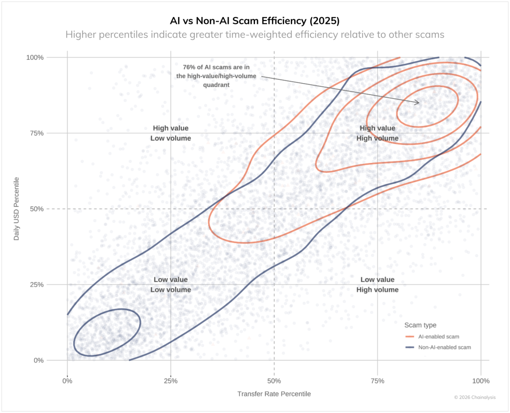 ZachXBT идентифицировал укравшего $2 млн криптоскамераМошеннические операции на базе искусственного интеллекта стали приносить в 4,5 раз больше дохода, чем традиционные схемы, отметили в Chainalysis. В среднем «более продвинутые» скамеры получают $3,2 млн из одной атаки по сравнению с $719 000 без ИИ-инструментов.