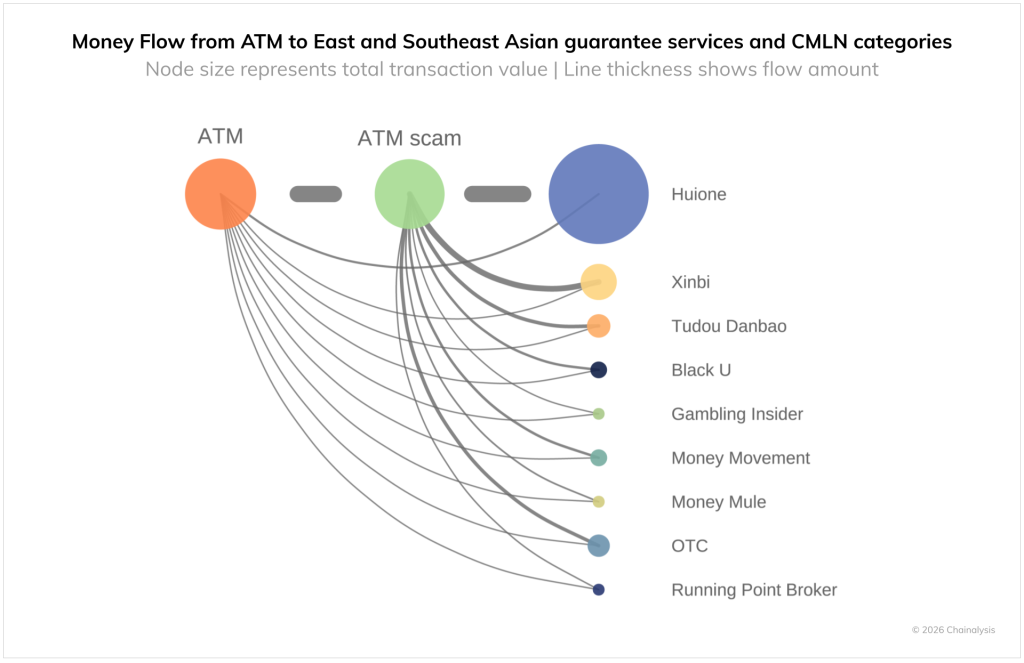 В Chainalysis выявили, что все задействованные в таких схемах деньги в конечном итоге оседают на кошельках, связанных с китайскими сетями отмывания средств (CMLN) и сервисами в Юго-Восточной Азии.