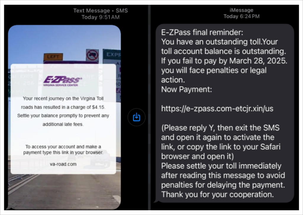 Киберпреступники использовали модель «фишинга как услуги» для массовой рассылки SMS, имитировавших сообщения от служб взимания дорожных сборов (в первую очередь E‑ZPass) как минимум в восьми штатах США.