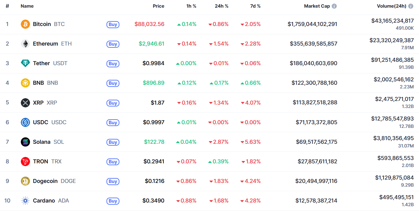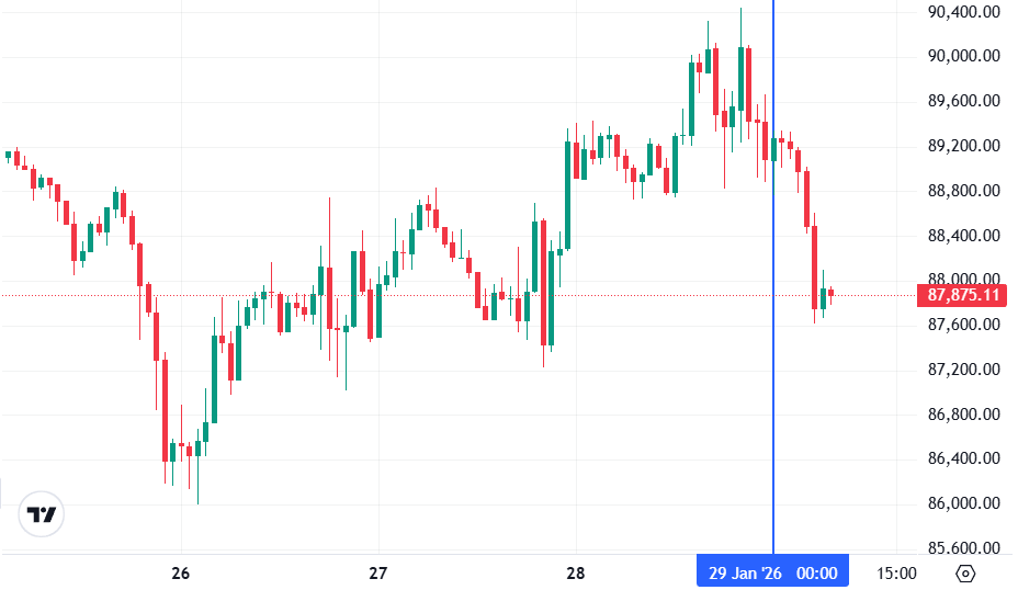 Биткоин (BTC), по данным ресурса TradingView, начал день с падения. По состоянию на 07:30 (МСК), криптовалюта торгуется по $87 875 (1 токен в рублях — ₽6 738 439). Минимум биткоина за 24 часа — $87 612, максимум — $90 439.