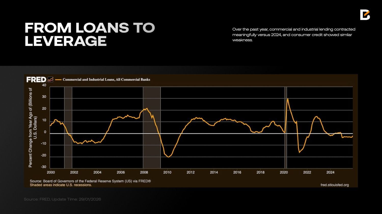 Примечательно, что даже после прекращения сокращения баланса ФРС этот спред не сократился заметно в январе. Одним из возможных объяснений является то, что в течение 2025 года банки направляли значительную часть своих ликвидных буферов в финансовые инвестиции, а не в кредитование коммерческого, промышленного и сектора недвижимости.