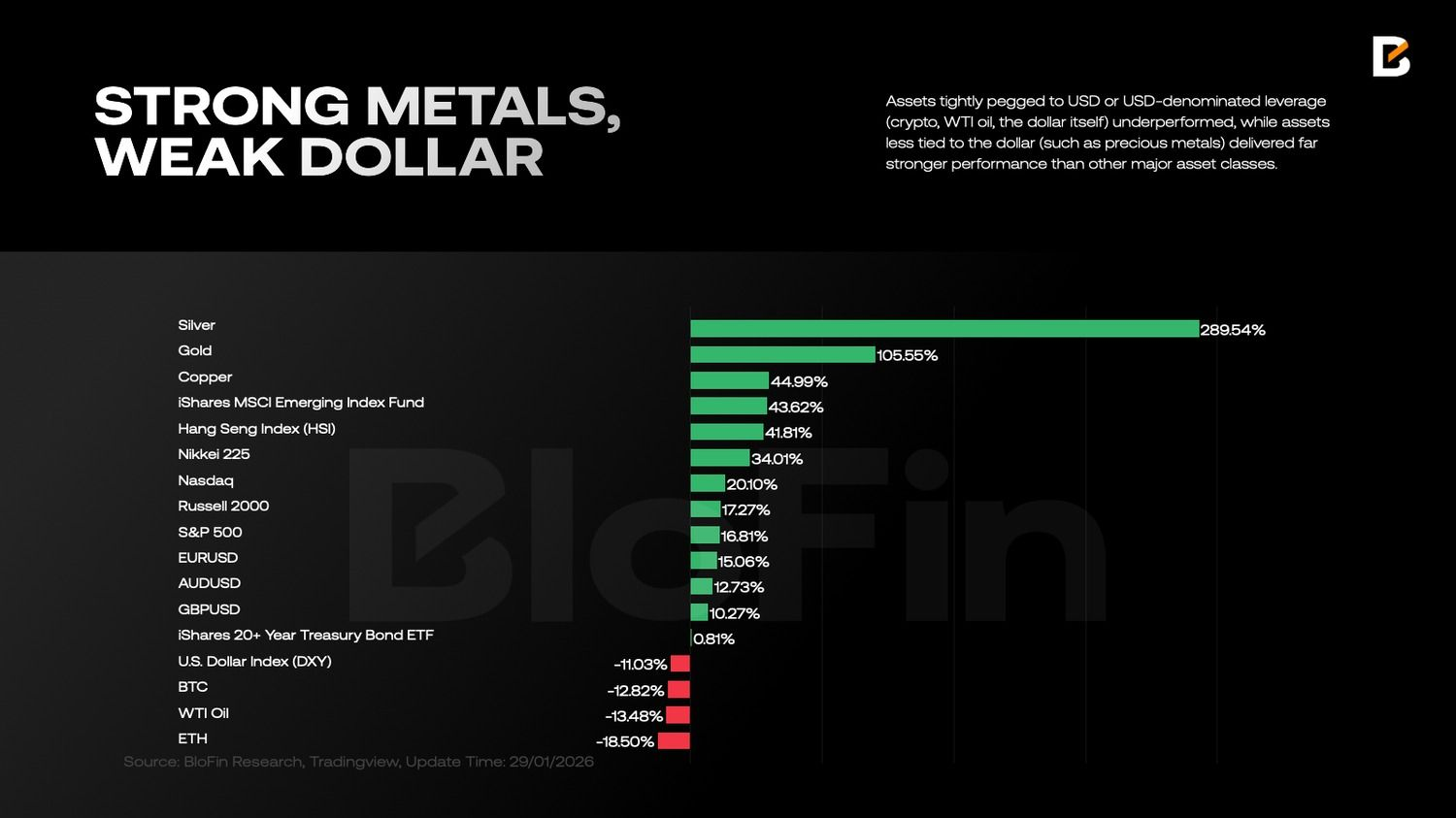 Активы, жестко привязанные к доллару или долларовой долговой нагрузке, включая криптоактивы, нефть WTI и сам доллар, показали более слабую динамику. В то же время активы с меньшей зависимостью от доллара, такие как драгоценные металлы, продемонстрировали значительно более высокую доходность по сравнению с большинством других классов активов.