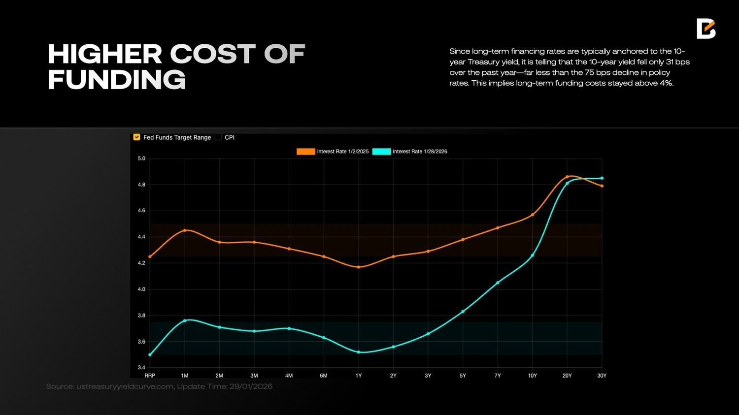 Поскольку долгосрочные ставки фондирования обычно привязаны к доходности 10-летних казначейских облигаций, показательно, что за последний год их доходность снизилась всего на 31 базисный пункт — значительно меньше, чем снижение ключевой ставки на 75 б.п. Это означает, что долгосрочная стоимость капитала оставалась выше 4%.
