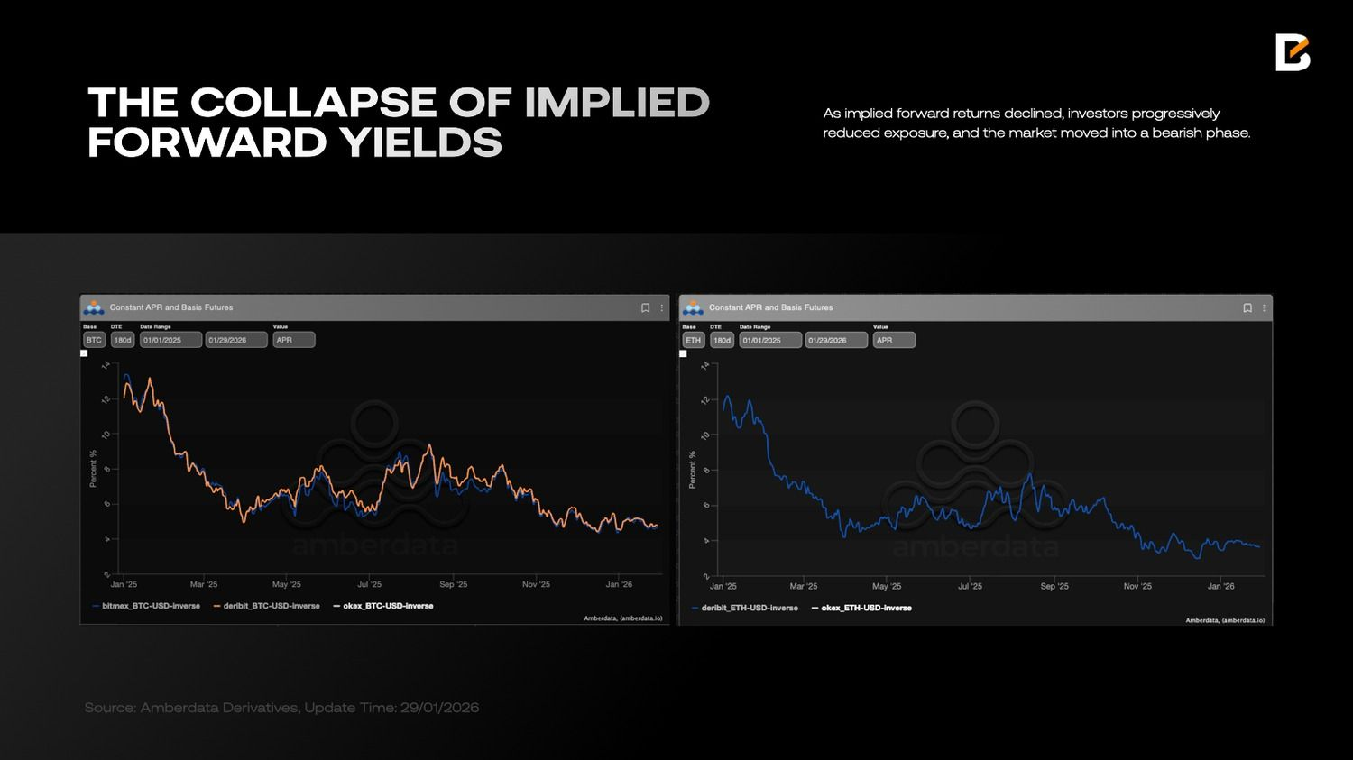 Высокие ставки фондирования ограничивают позиционирование. Когда подразумеваемая будущая доходность рискованного актива опускается ниже доходности казначейских облигаций, долгосрочное владение таким активом теряет привлекательность. Крипторынок стал наглядным примером: по мере снижения ожидаемой доходности инвесторы последовательно сокращали экспозицию, а рынок перешел в медвежью фазу.