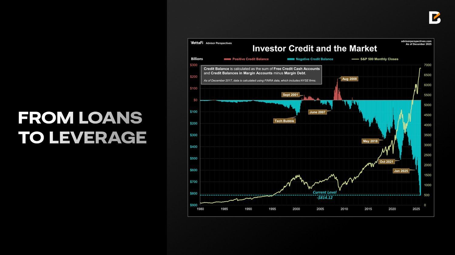 За последний год объем кредитования бизнеса и промышленности существенно сократился по сравнению с 2024 годом, а потребительское кредитование продемонстрировало схожую слабость. При этом, согласно данным VettaFi, маржинальный долг вырос на 36,3% за год и достиг исторического максимума $1,23 трлн в декабре 2025 года, а чистые дебетовые балансы инвесторов увеличились до −$814,1 млрд, практически повторив темпы роста маржинального долга.