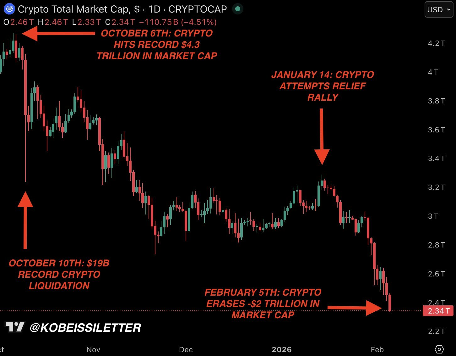Аналитики The Kobeissi Letter обратили внимание и на структуру самого падения. По их данным, за одну сессию цена снизилась более чем на $9 000, а в отдельные моменты рынок терял свыше $2 000 за считанные минуты. Они допускают, что движение могло быть связано с ликвидацией или распродажей позиции крупным институциональным игроком, что усилило давление на рынок.