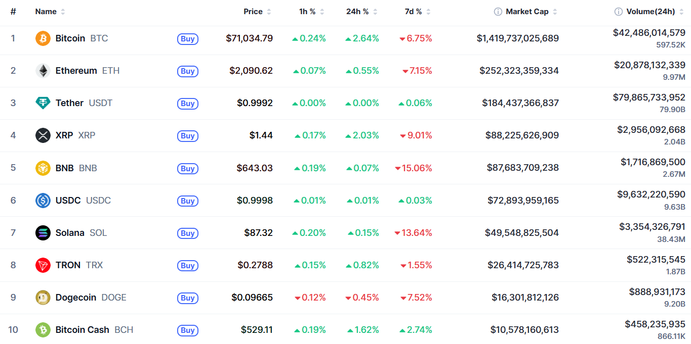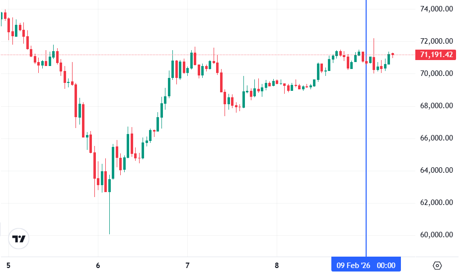 Биткоин (BTC), по данным ресурса TradingView, начал день с бокового движения. По состоянию на 07:32 (МСК), криптовалюта торгуется по $71 191 (1 токен в рублях — ₽5 450 556). Минимум биткоина за 24 часа — $69 041, максимум — $72 206.