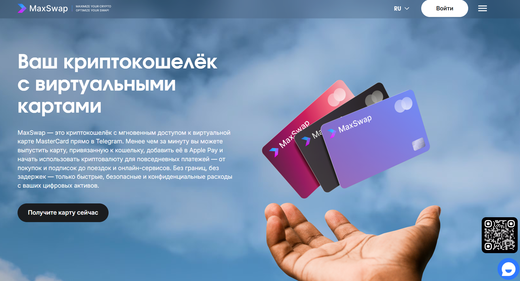 MaxSwap — это кастодиальный криптокошелек с возможностью мгновенного выпуска виртуальной карты Mastercard прямо в Телеграм.