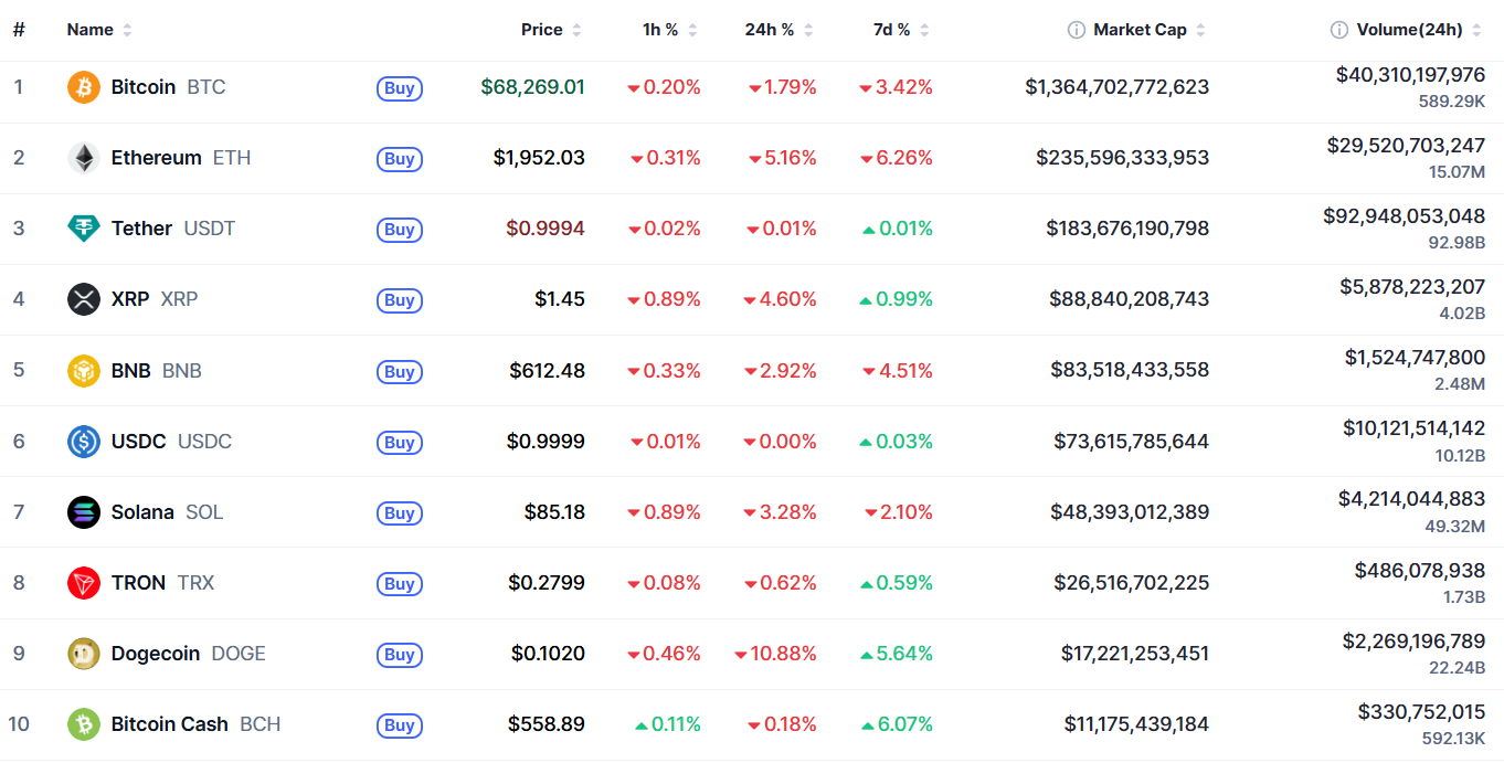 В топ-10 самых капитализированных криптовалют все монеты дешевели в течение 24 часов. Наибольшие потери за сутки — у Dogecoin (-10,88%), за неделю — у Ethereum (-6,26%). Лучший результат за семь дней — у Bitcoin Cash (+6,07%).