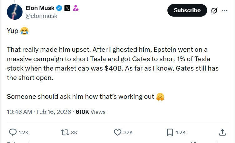 Джеффри Эпштейн и Билл Гейтс шортили акции Tesla, то есть ставили на снижение их рыночной цены. Для компании это негативный фактор. Давление шортов бьет по капитализации, усиливает волатильность и создает вокруг бумаг негативный рыночный фон. Об этом рассказал основатель Tesla Илон Маск в X, отвечая на один из комментариев пользователей. Эпштейн пытался выйти на связь The post Илон Маск рассказал о попытках Эпштейна и Билла Гейтса «потопить» Tesla appeared first on BeInCrypto.