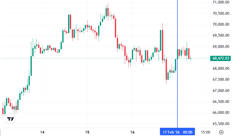 Биткоин (BTC), по данным ресурса TradingView, начал день с бокового движения. По состоянию на 07:19 (МСК), криптовалюта торгуется по $68 472 (1 токен в рублях — ₽5 267 719). Минимум биткоина за 24 часа — $67 301, максимум — $70 067.