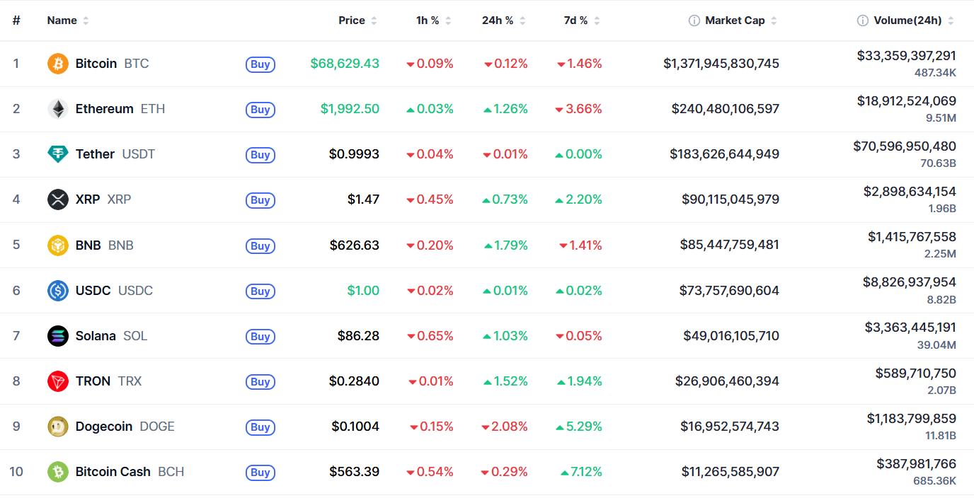 В топ-10 самых капитализированных криптовалют лучший результат за сутки — у BNB (+1,79%), за неделю — у Bitcoin Cash (+7,12%). Наибольшие потери за 24 часа — у Dogecoin (-2,08%), за семь дней — у Ethereum (-3,66%).