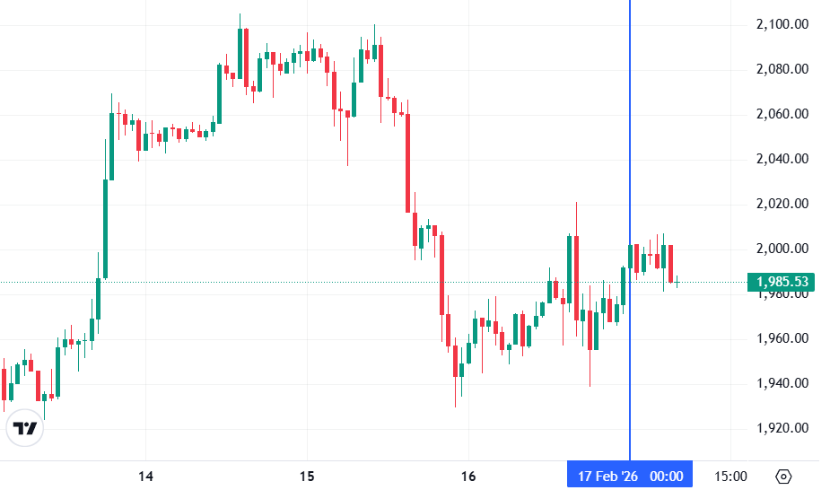 Вторая по капитализации криптовалюта Ethereum также начала день с бокового движения. По состоянию на момент написания обзора, монета торгуется по $1 985 (1 токен в рублях — ₽153 242).
