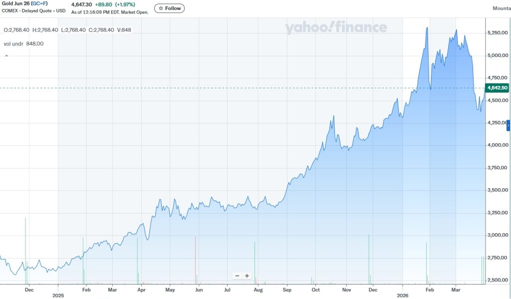В марте золото зафиксировало самое глубокое месячное падение с 2008 года. Актив торгуется на отметках вблизи $4640, что означает рост почти на 50% за последние 12 месяцев.