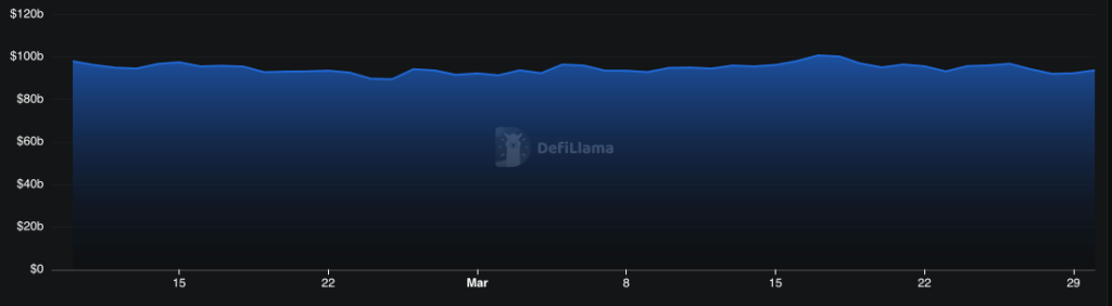 Общий объем заблокированной стоимости в DeFi-протоколах вырос с $92,2 млрд до $93,6 млрд. В экосистеме Ethereum показатель тоже слегка прибавил — c $53,2 млрд до $53,4 млрд.