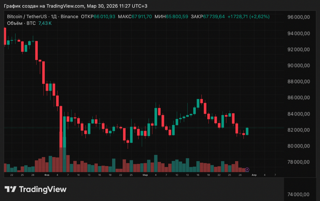 В минувшем месяце цена первой криптовалюты на Binance в моменте поднималась выше $76 000. По состоянию на 30 марта цифровое золото торгуется на отметках около $67 800.