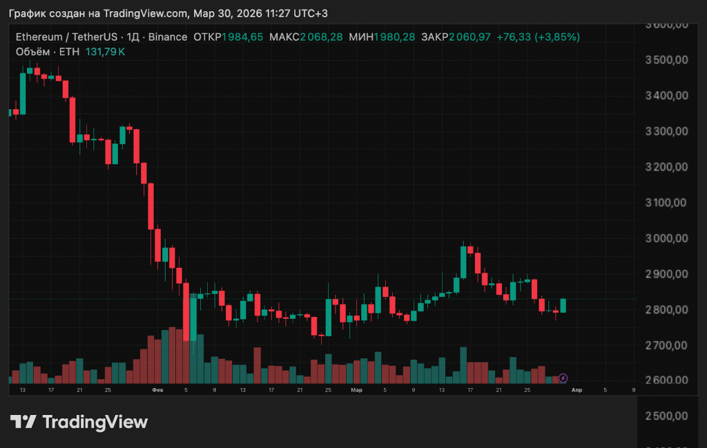 В начале марта котировки Ethereum показали кратковременный рост к уровню $2200, но не смогли на нем закрепиться. В середине месяца вторая по капитализации криптовалюта повторила рывок, добравшись до $2380. На 30 марта курс пытается удержаться выше $2000.