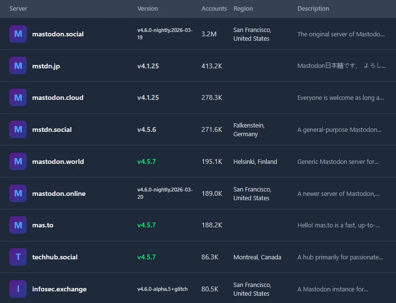 На сайте разработчиков Mastodon представлено более 7000 активных инстансов с примерно 745 000 пользователей по состоянию на март 2026 года. Все они добровольно согласились следовать «кодексу чести» платформы: вести активную модерацию проблемного контента и заботиться о безопасности.