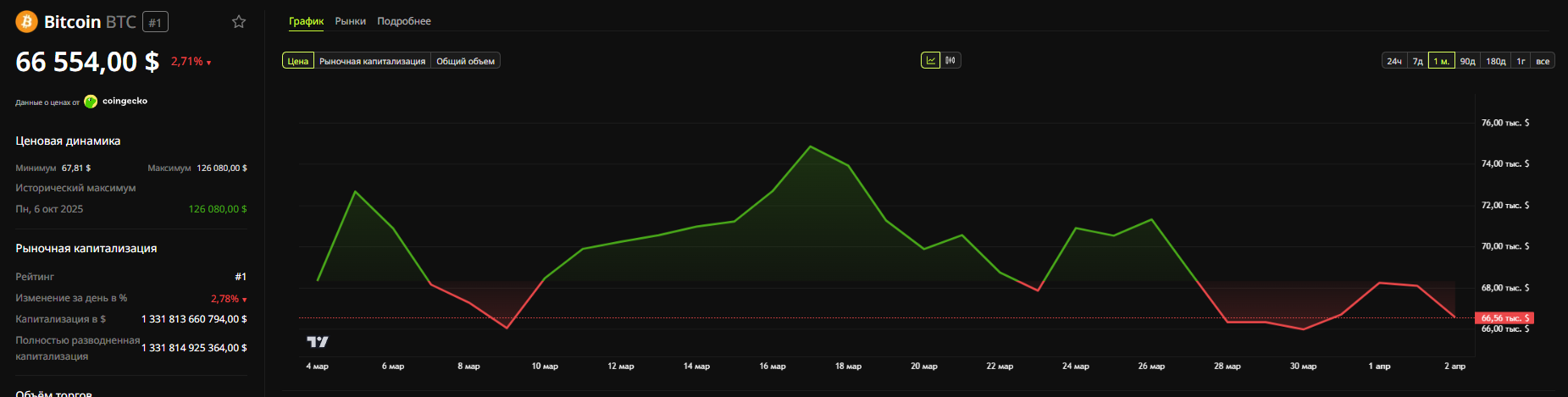 Биткоин за день просел с $69 135 до $66 554. Ethereum снизился на 2,8%, до $2 084. За один вечер двухдневный рост крипторынка сошел на нет.