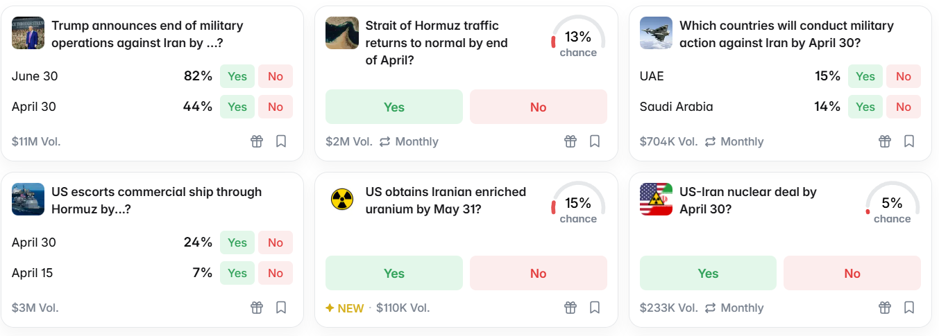 На рынках прогнозов, судя по результатам голосования, инвесторы также не верят в скорое разрешение конфликта. Например, на возобновление свободного судоходства в Ормузском проливе до конца апреля дают только 13% шансов.