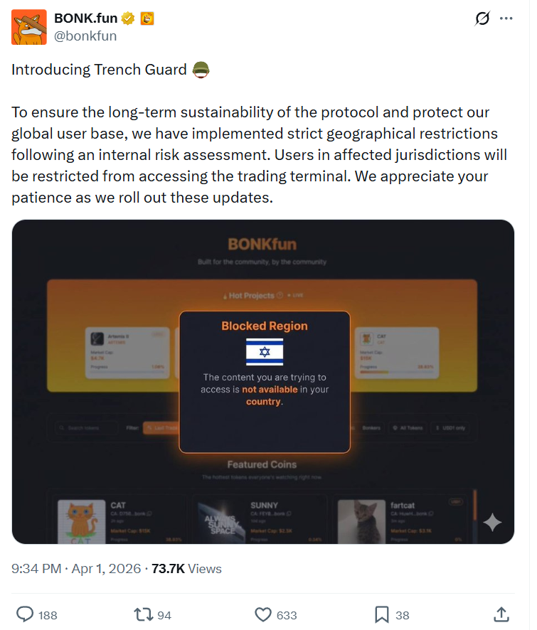 В «день дурака», 1 апреля 2026, года мемкоин-платформа Bonk.fun на базе Solana опубликовала шуточный анонс функции, который быстро перерос в политическую шутку. В нем команда намекнула на то, что граждане Израиля якобы станут нежелательными пользователями сервиса. В «апдейте» речь шла о системе Trench Guard. На скриншоте с якобы реальным геоблоком высвечивается израильский флаг, и надпись The post 1 апреля стало поводом для высмеивания блокировок в криптоиндустрии appeared first on BeInCrypto.