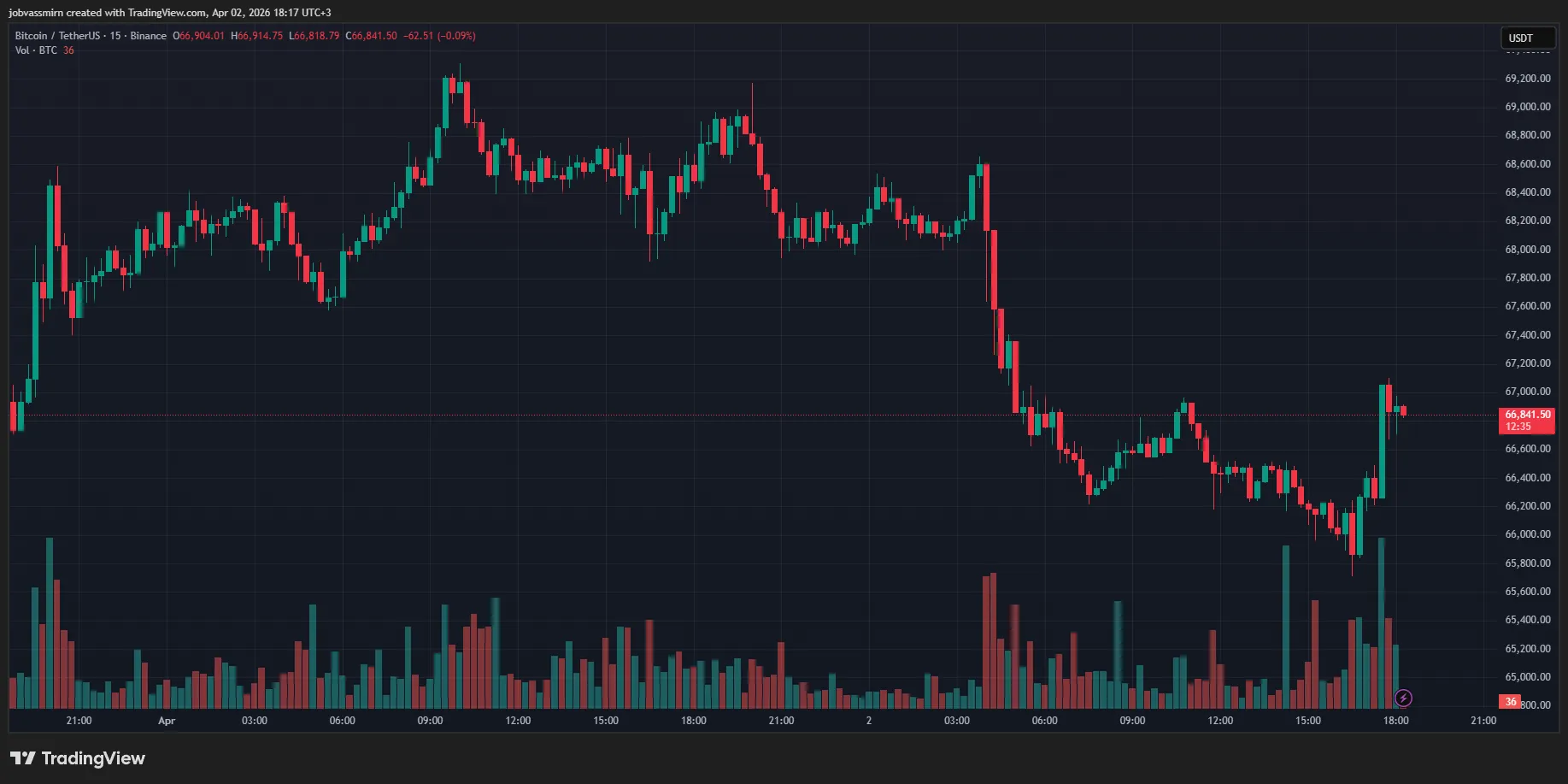 2 апреля первая криптовалюта проваливалась ниже $67 000 после неоднозначного заявления президента США Дональда Трампа о конфликте на Ближнем Востоке.