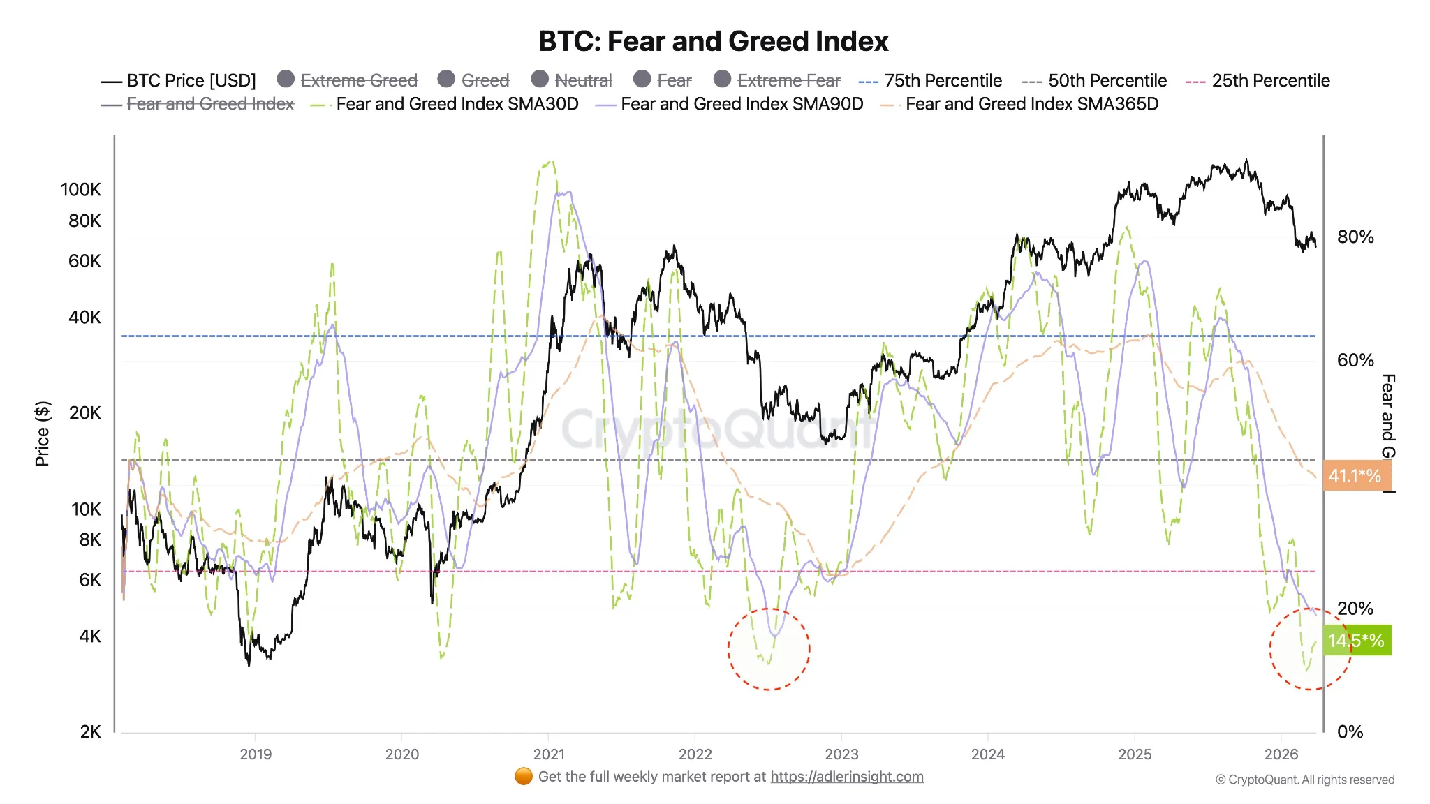 Как пишет аналитик CryptoQuant Аксель Адлер — младший, структура индекса страха и жадности демонстрирует сходство с 2022 годом, фиксируя одинаково низкие значения около 10-15%. При этом 365-дневная скользящая средняя показателя «все еще слишком высока для полного перезапуска медвежьего рынка».