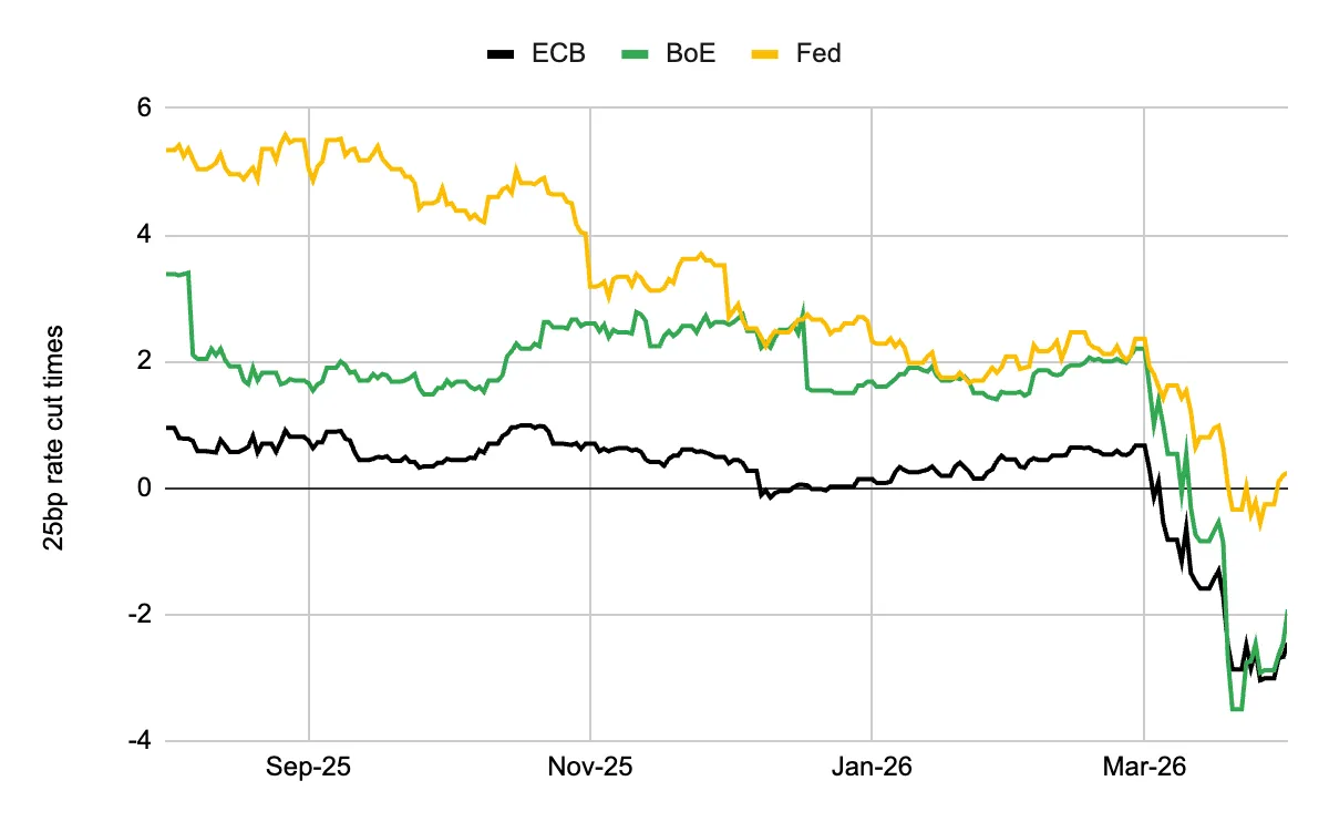 «С момента начала иранского конфликта в конце февраля ожидания двух снижений ставки ФРС в этом году упали до нуля; ЕЦБ перешел от „паузы“ к ожиданиям ~2,5 повышений; Банк Англии развернулся от двух снижений к двум повышениям — необычно резкая переоценка», — говорится в отчете.