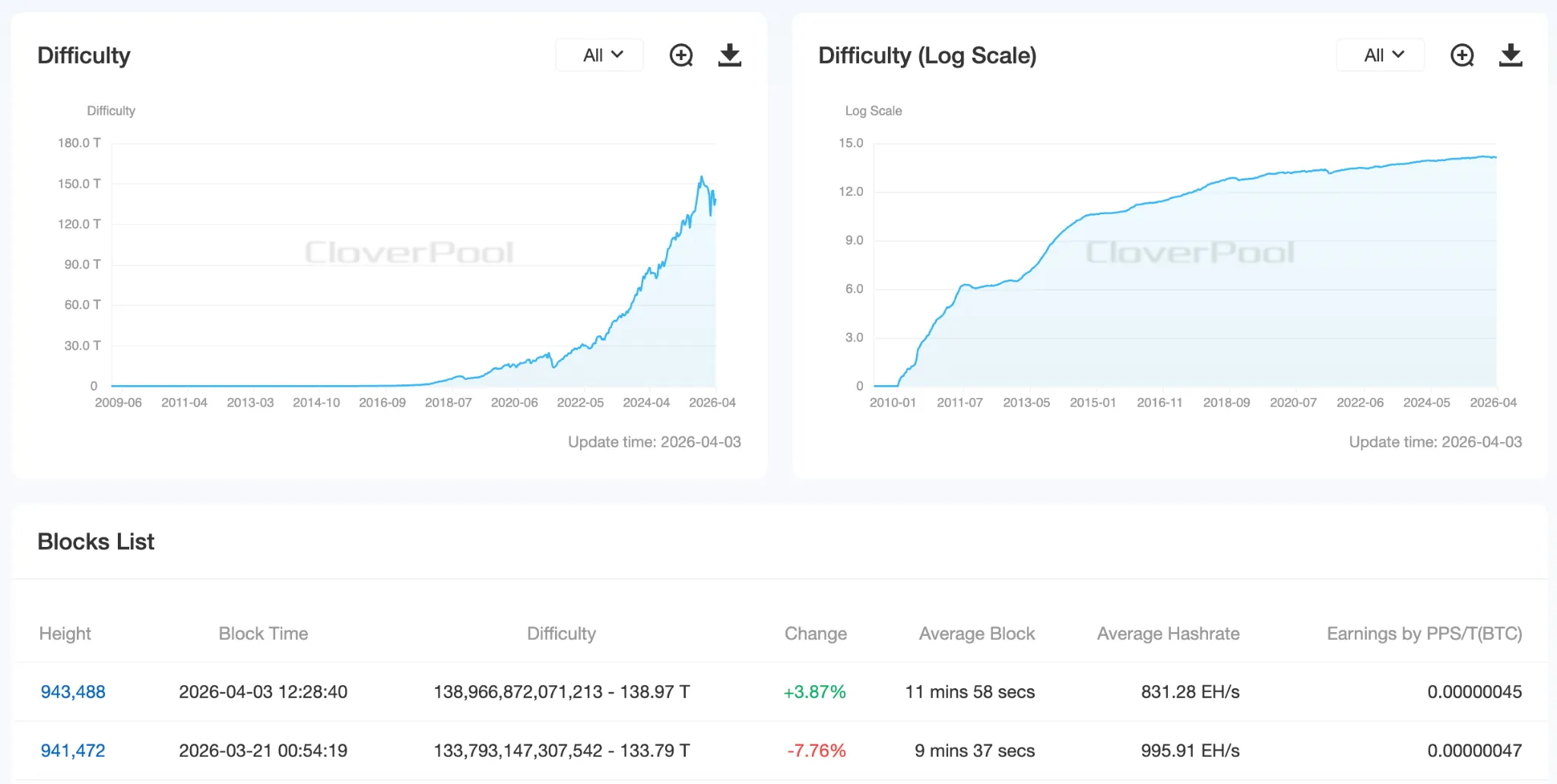 Конкуренция в секторе продолжает расти. Сложность майнинга биткоина недавно снизилась на 7,7% — самое резкое снижение с февраля. 3 апреля в результате очередного перерасчета показатель поднялся на 3,87% — до 138,97 T.