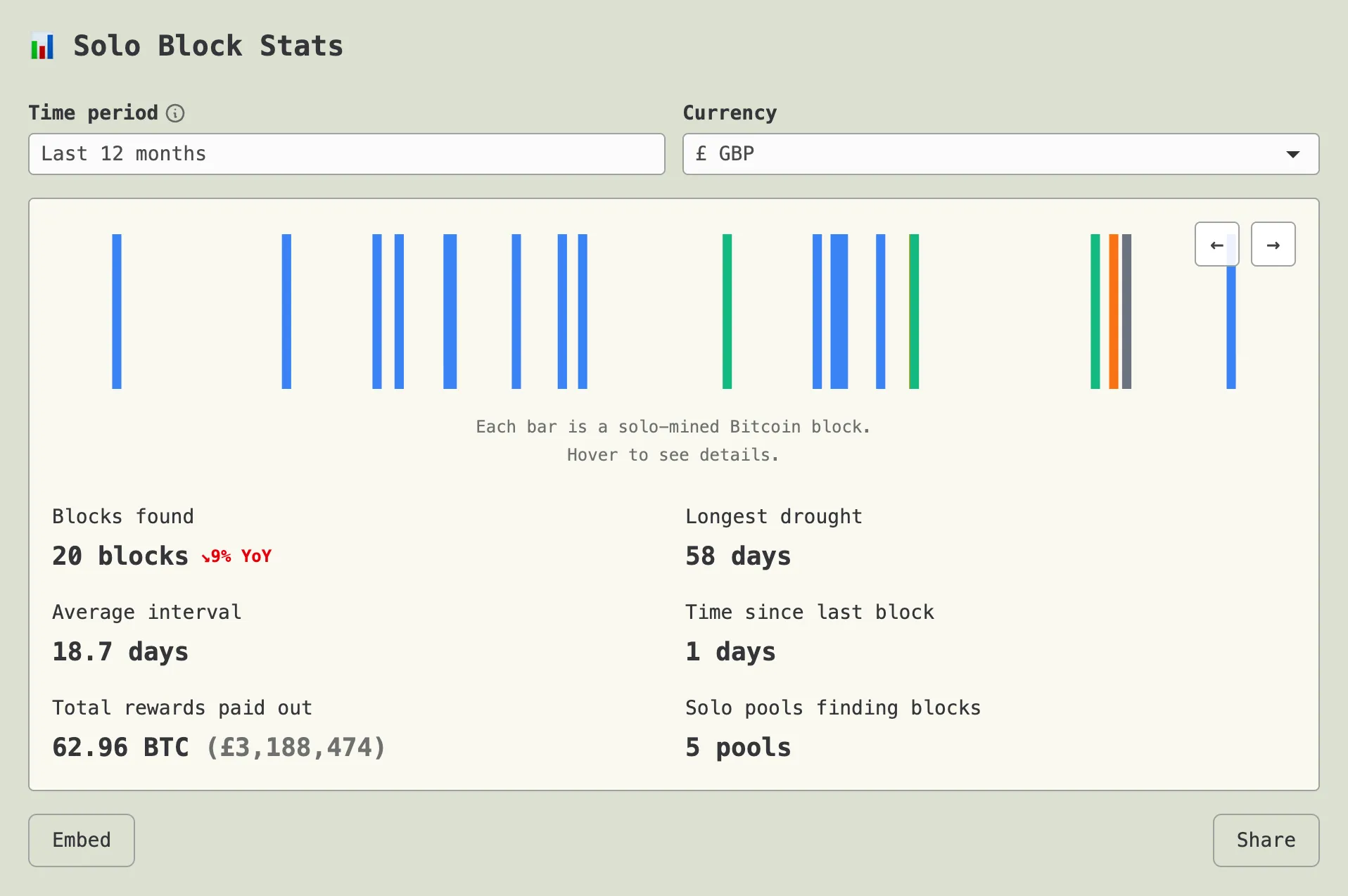 За последние 12 месяцев соло-майнеры нашли только 20 блоков, получив 62,96 BTC. В среднем это одна «победа» каждые 18,7 дня. Максимальный перерыв достигал 58 дней.