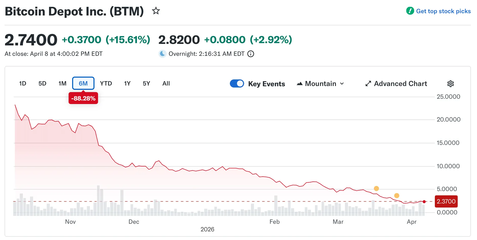 По итогам торгов 8 апреля акции Bitcoin Depot выросли на 15,6%, закрывшись на отметке $2,74. Однако за последние шесть месяцев бумаги подешевели на 88%.
