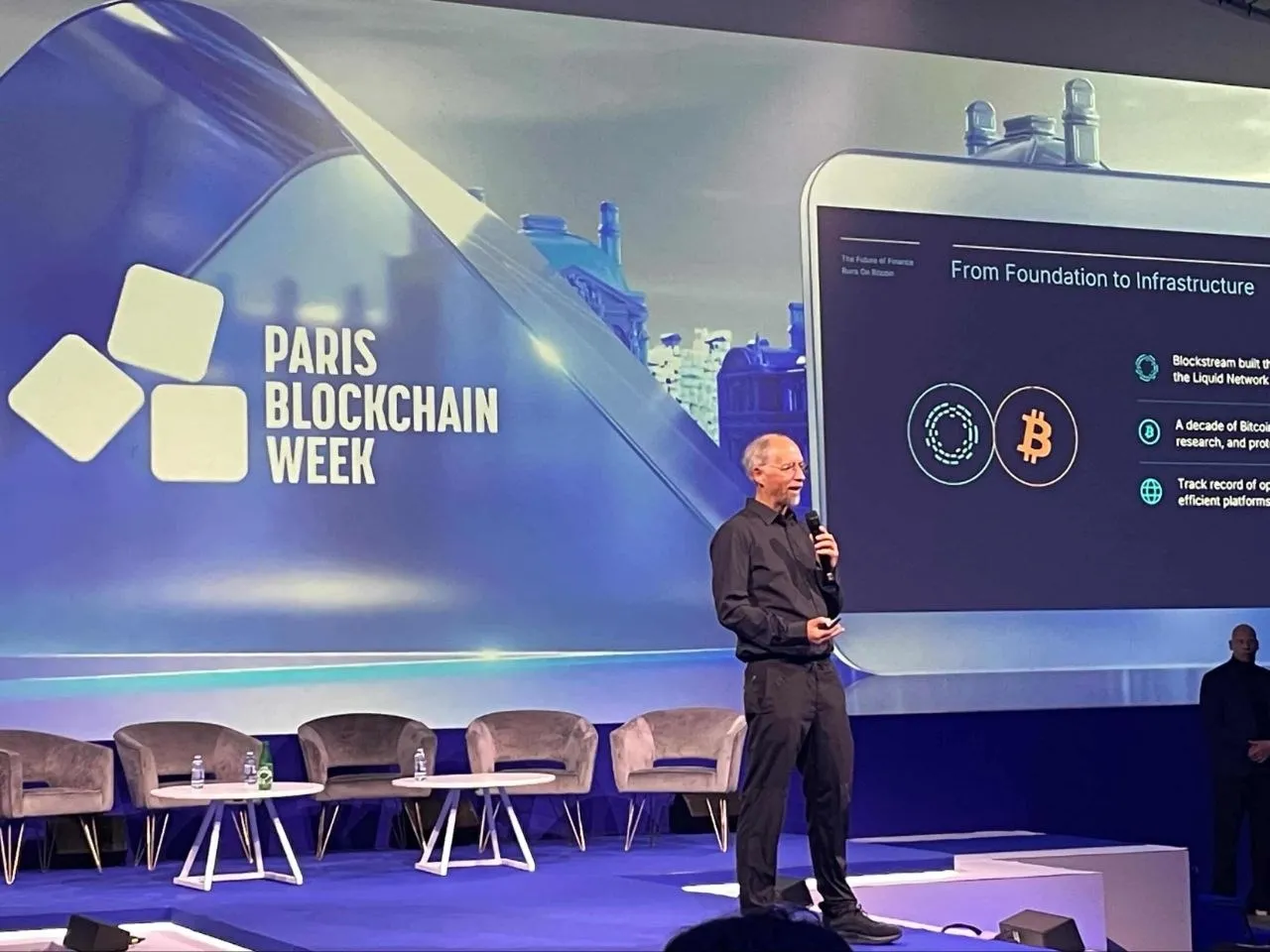 Адам Бэк выступает на Blockchain Paris Week. Источник: ForkLog.