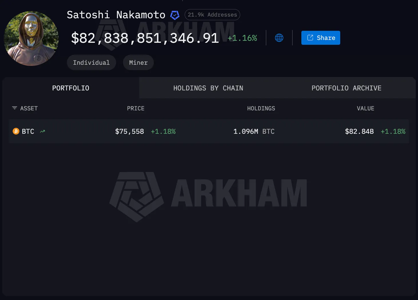 По данным Arkham, объем активов под управлением Накамото составляет 1,096 млн BTC стоимостью $82,8 млрд по текущему курсу. Однако эти активы могут принадлежать и другому раннему игроку, считает Бэк.