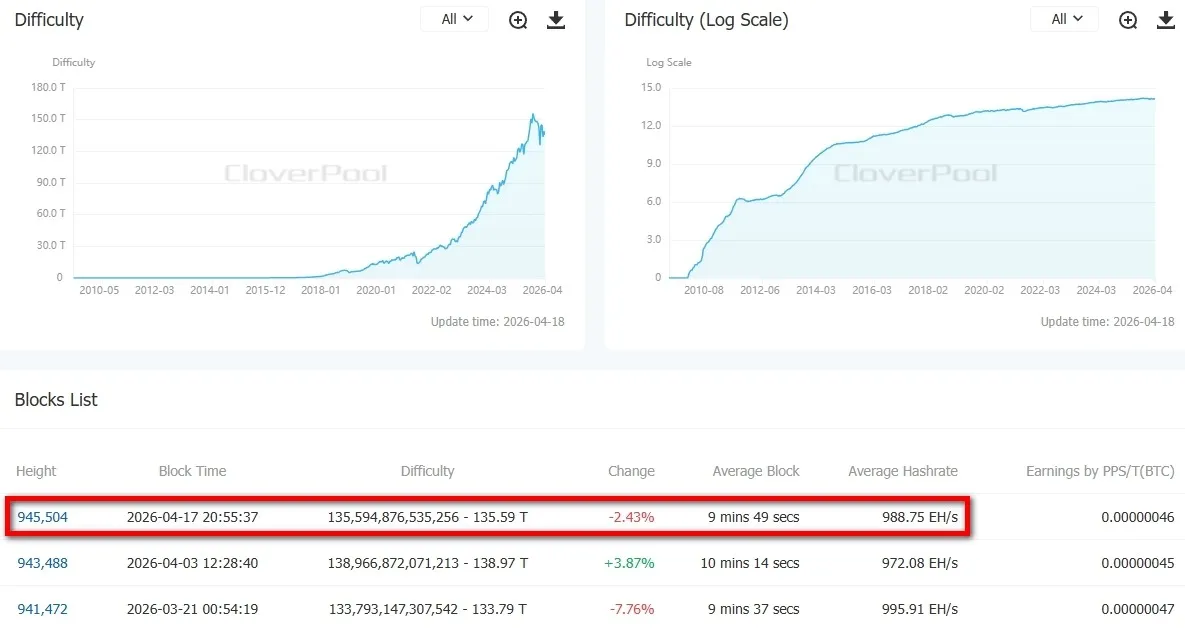 Средний хешрейт на момент написания составляет 988,7 EH/s. Межблочный интервал сократился до менее чем 10 минут.